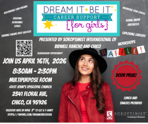 Soroptimist International of Chico and Soroptimist International of Bidwell Rancho are offering this 1-day conference that will introduce them to mentors/role models, careers, and resources to help them reach their dreams.